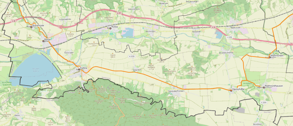 Aus der Gemeinde Südharz kommend findet der Kupferspuren Radweg seinen Weg durch die Karstlandschaft über die Scharfe Leite nach Bösenrode. Von dort aus geht es weiter nach Berga und entlang der Landstraße vorbei an den Kiesgruben nach Kelbra (Kyffhäuser).