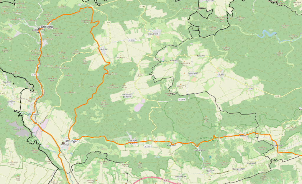 Nach dem Durchqueren von Rottleberode führt der Weg durch dichte Wälder weiter in die Fachwerkstadt Stolberg (Harz). Das märchenhafte Städtchen bietet mit dem Schloss Stolberg, dem Hirschdenkmal, der Lutherbuche und vielen weiteren Sehenswürdigkeiten zahlreiche Gründe für eine Pause.